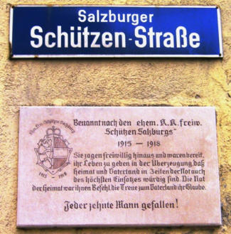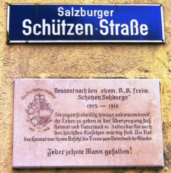 Salzburger-Schützen-Straße in Salzburg-Itzling; von der Itzlinger Hauptstraße zum Bahngeleise (Verlängerung der Erzherzog-Eugen-Straße), 1968 Gedenktafel-Renovierung dank Vizebürgermeister Harry Preuner