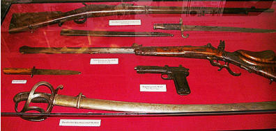 Vier Schaukästen, zwei Figurinen und andere Objekte bieten dazu Anschauungsmaterial.